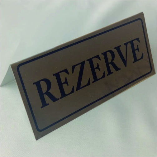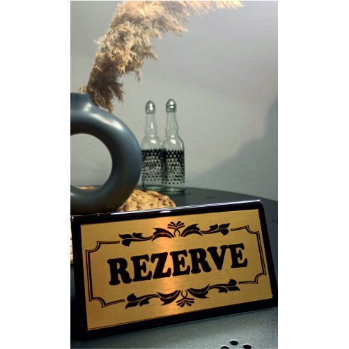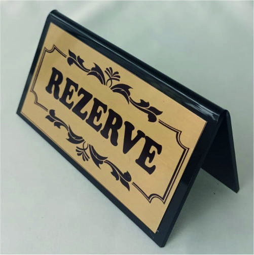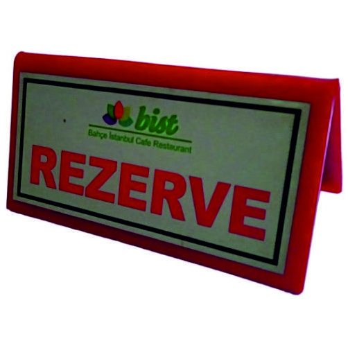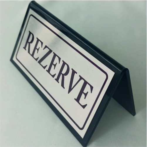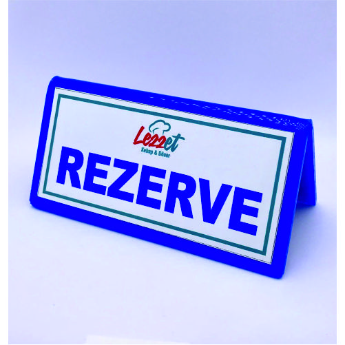 Masa Üstü Rezerve Yazısı Dijital baskılı alüminyumdan mamuldür. 20*5.5 cm ebatlarındadır.